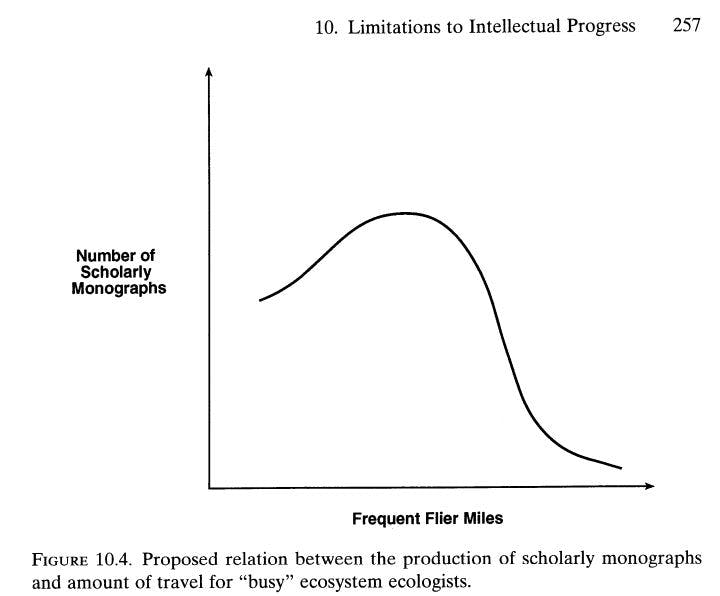 Antalet djupa vetenskapliga texter minskar när ”frequent flyer miles” läggs på hög. Med ”monographs” syftar han på substantiella intellektuella insatser, inte vanliga vetenskapliga artiklar (ungefär som skillnaden mellan att vara den som driver verklig förändring, eller att bara skriva under ett allmänt brev från någon branschorganisation).