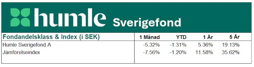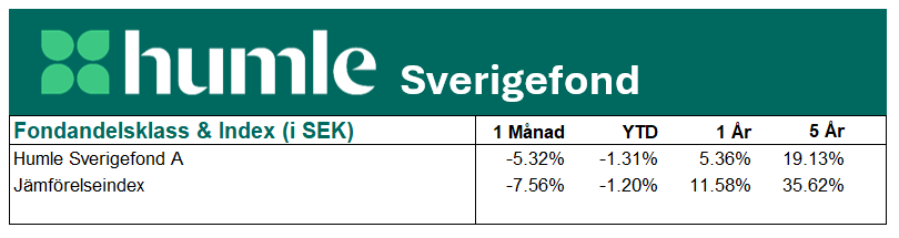 Fondens värde minskade under månaden med 5,32 %, medan jämförelseindex (SIXPRX) var ner 7,56 %. Under de senaste tolv månaderna har fonden 5,36 %, jämfört med en ökning med 11,6 % för index.